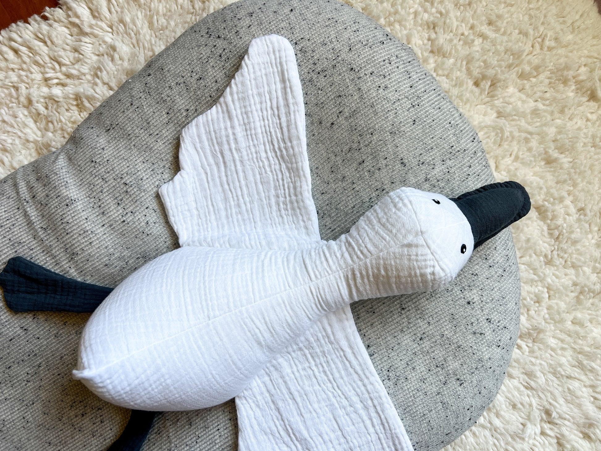 Our handmade geese are a perfect timeless addition to any collection. Darling in a nursery and loads of fun and cuddles as your child grows. A wonderful gift for the special silly goose in your life. Cloud is a snow white.