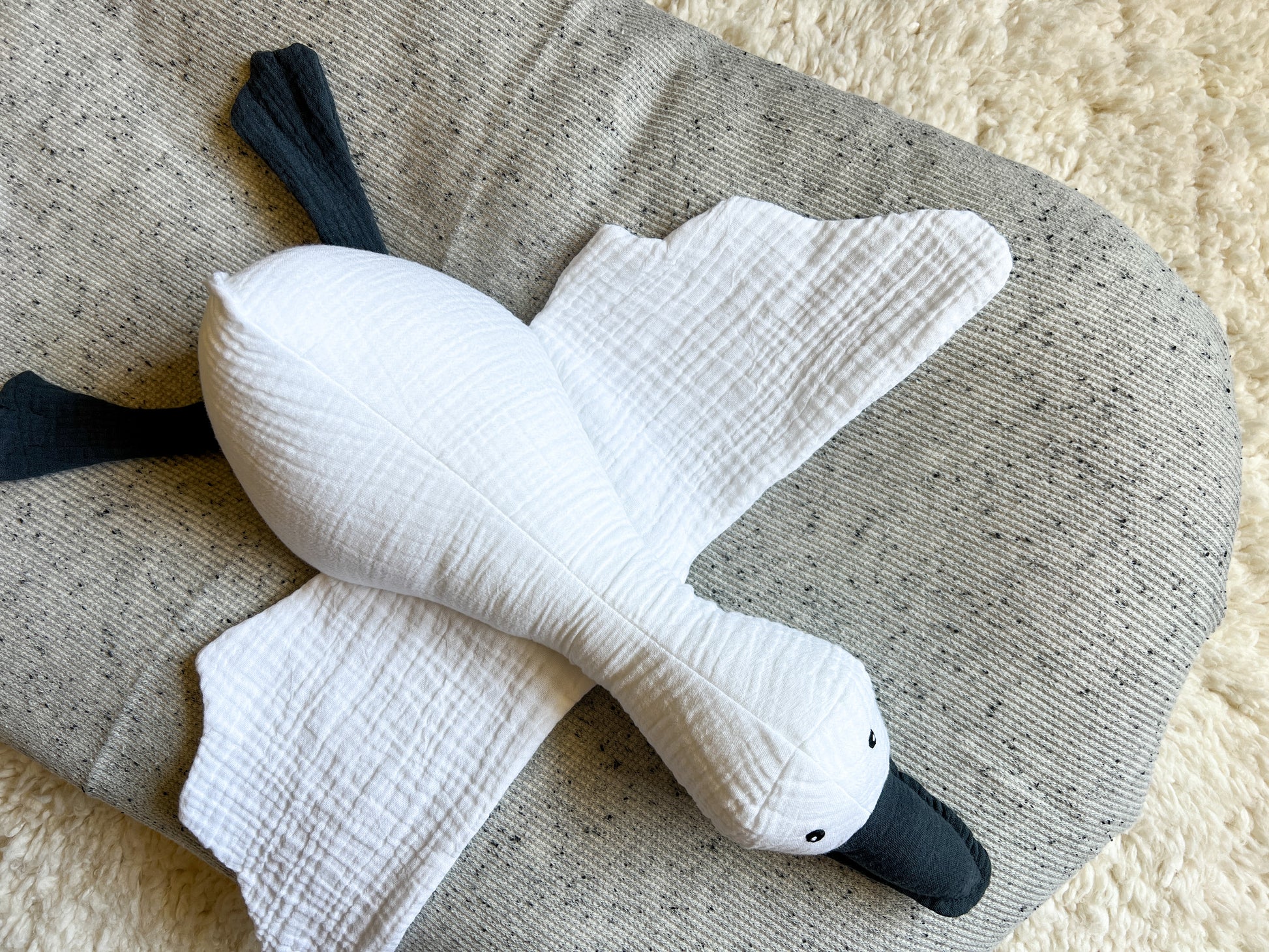 Made from 100% cotton muslin double gauze and filled with ultra plush hypoallergenic polyfil, the Duck Duck Goose measures 18” from beak to bum. Hand embroidered cotton eyes give a beautiful vintage touch and bring peace of mind.