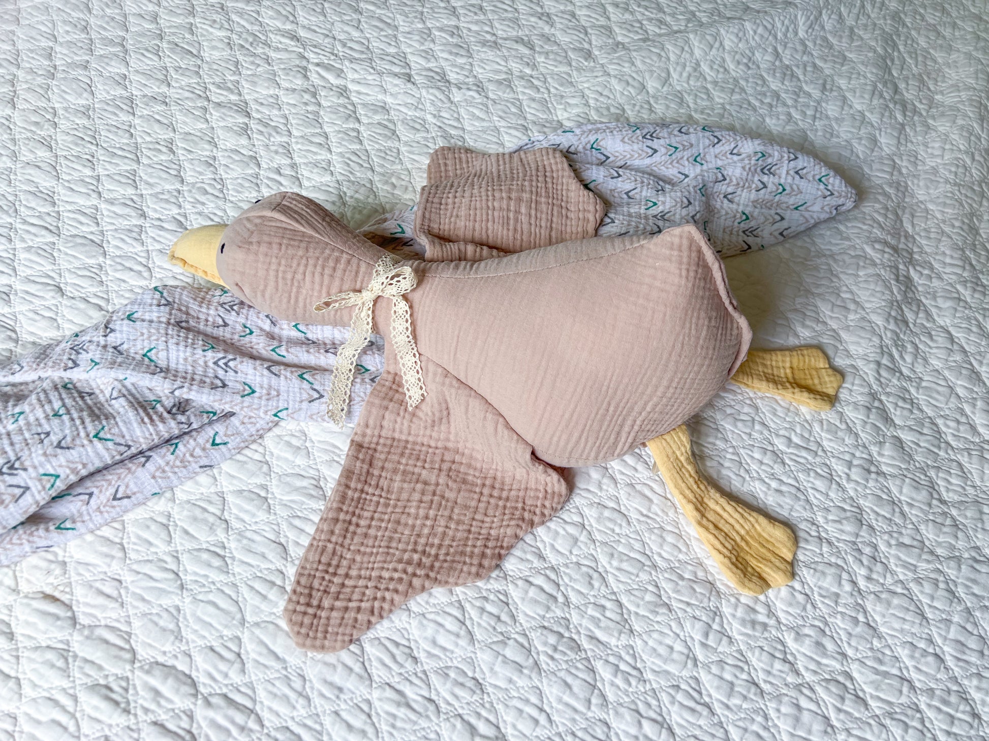 Made from 100% cotton muslin double gauze and filled with ultra plush hypoallergenic polyfil, the Duck Duck Goose measures 18” from beak to bum. Hand embroidered cotton eyes give a beautiful vintage touch and bring peace of mind.