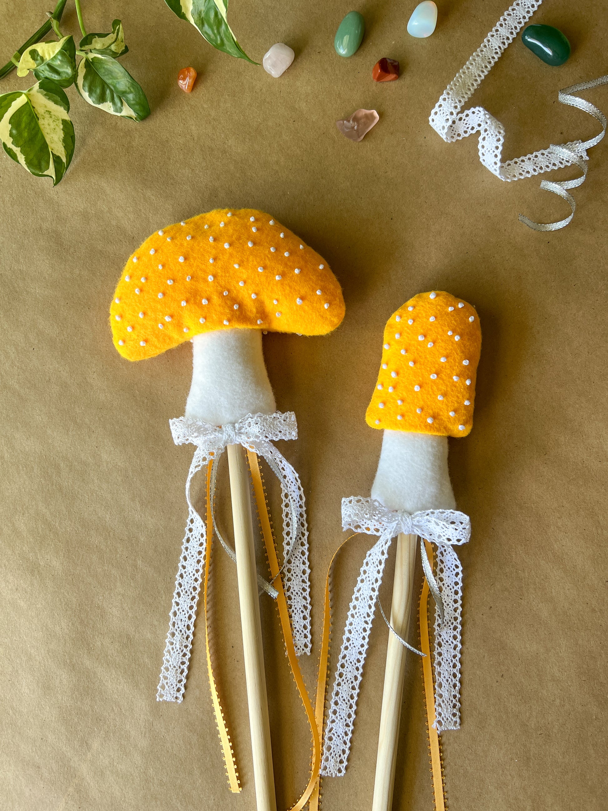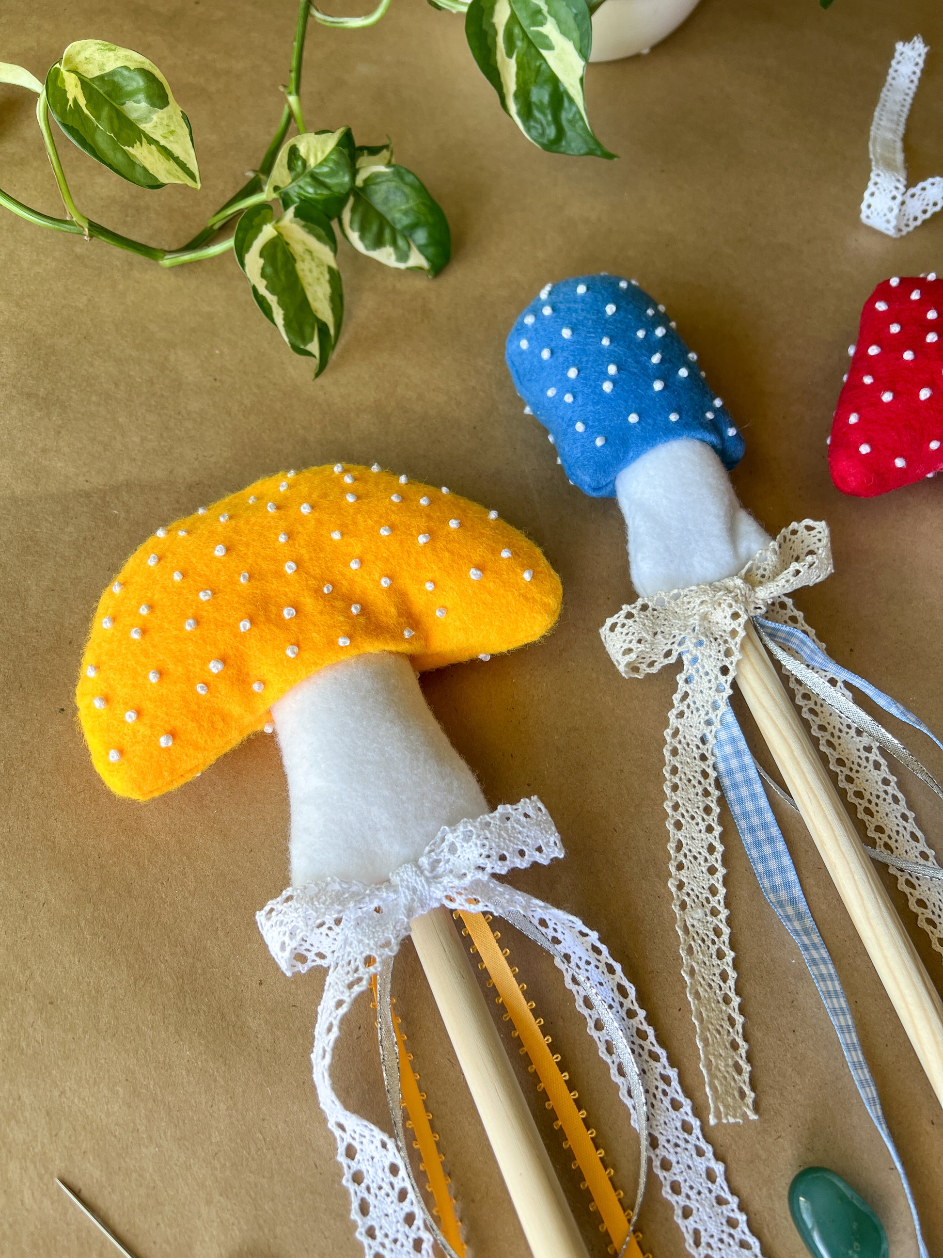 Our plush Mushroom Fairy Wands are made from polyester felt and are lightly filled with a hypoallergenic polyfil. All wands have a smooth pine handle and are decorated with an assortment of cotton and polyester ribbons. Every wart is French knotted by hand and placed at random, meaning no two mushrooms will ever be identical - just like in nature!